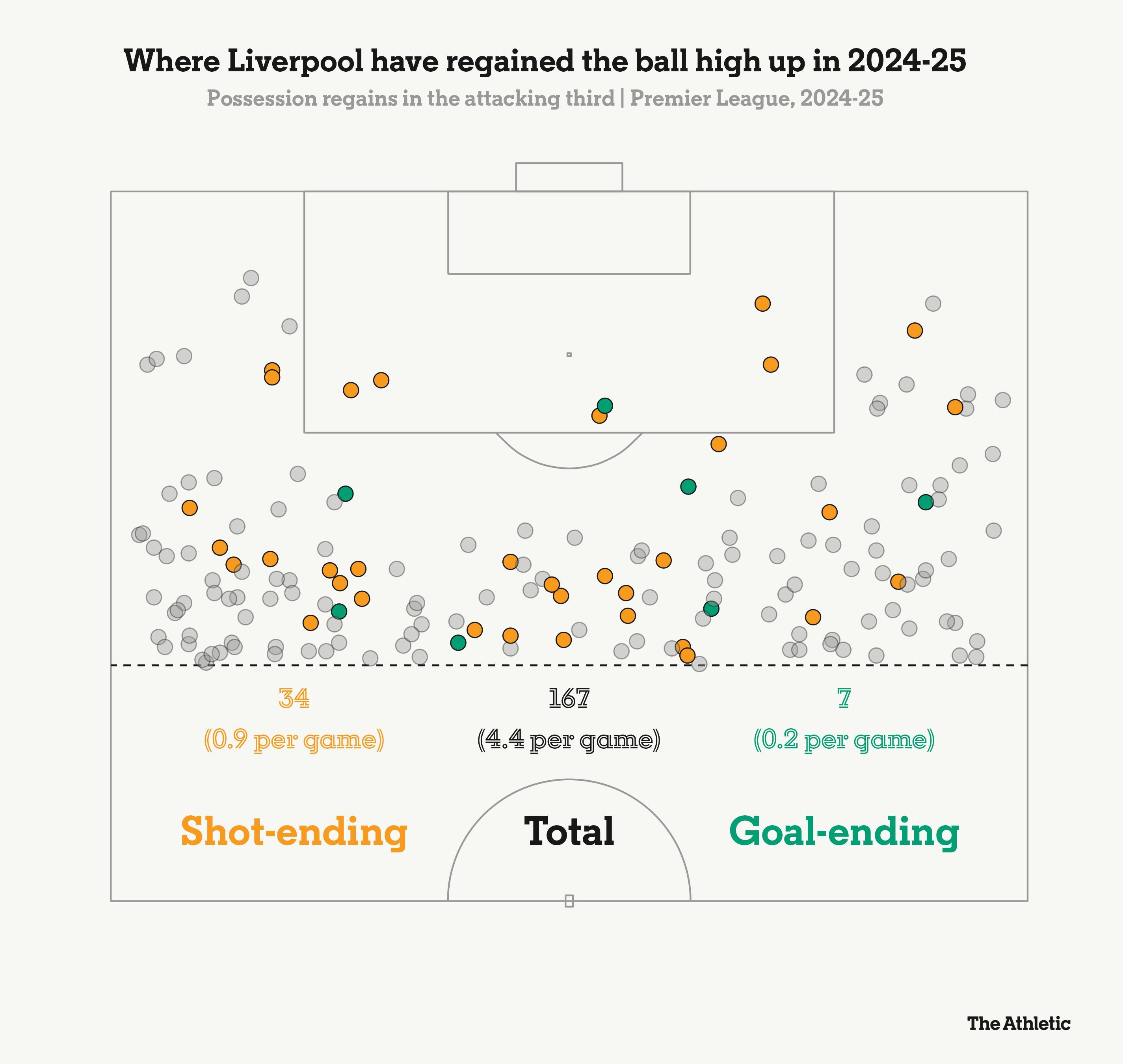 然而,薩拉赫的角色只是利物浦更廣泛的壓迫問題的一部分。上賽季,路易斯-迪亞斯(9號位)和索博斯洛伊(10號位)在設定利物浦無球工作基調方面發揮了關鍵作用。