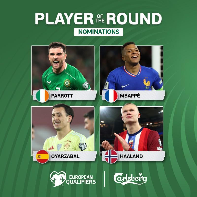 北京時間11月16日,歐足聯官方公布了世預賽歐洲區本輪比賽最佳球員的四位候選者,帕羅特、姆巴佩、奧亞薩瓦爾以及哈蘭德入圍。