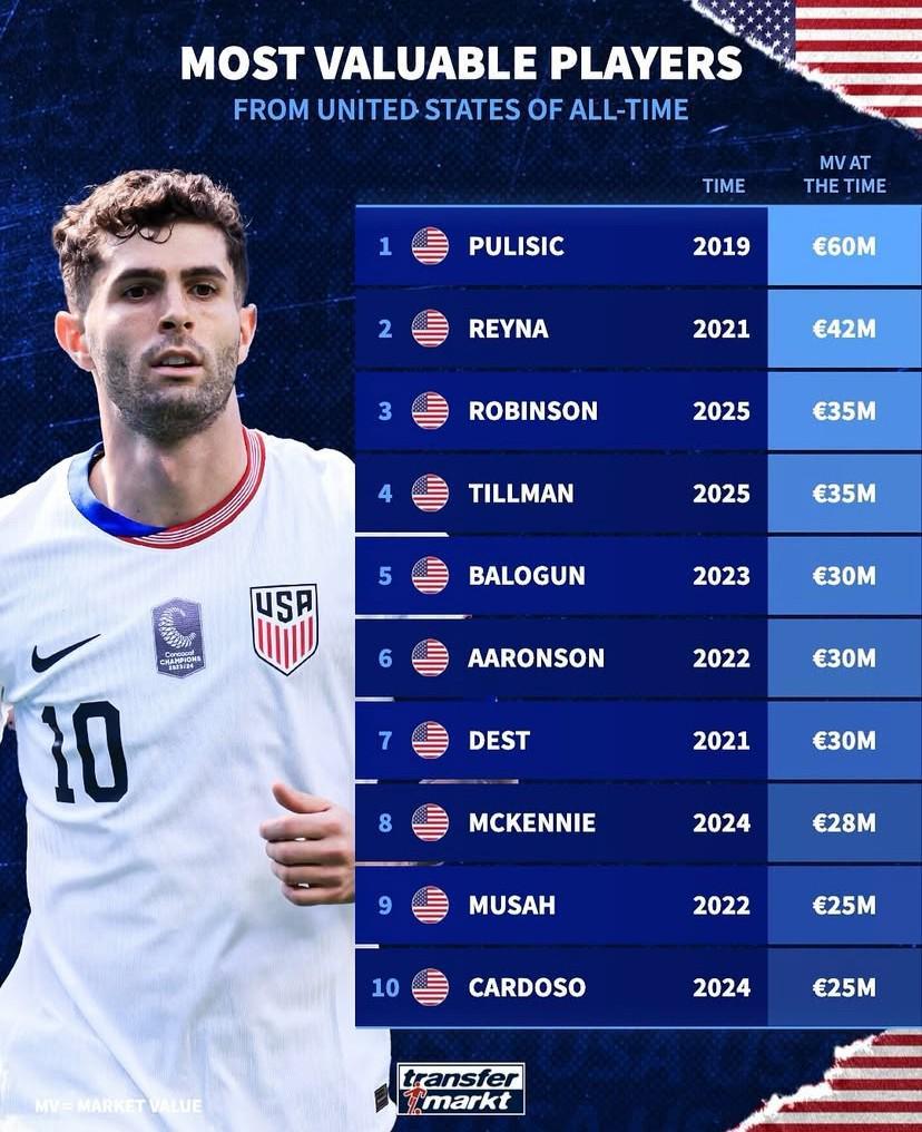 北京時間11月16日,德轉(zhuǎn)列出了美國球員歷史身價排名前10的球員,2019年身價曾經(jīng)達到6000萬歐元的普利希奇高居第一,吉奧瓦尼-雷納4200萬歐元第二,安東尼-羅賓遜和馬利克-蒂爾曼同以3500萬歐元并列第三。