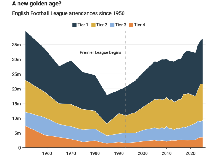 如今英格蘭的足球觀賽人數達到了 20 世紀 50 年代以來的最高水平,各級別賽事的觀眾人數持續增長,低級別聯賽尤為顯著。