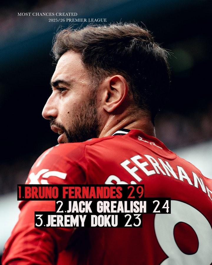 曼聯(lián)官方曬出數(shù)據(jù)統(tǒng)計,隊長布魯諾-費爾南德斯本賽季在英超創(chuàng)造29次機會,目前是所有英超球員中最多的,比排名第二的格拉利什(24次)多5次,多庫則創(chuàng)造了23次機會,排在第三名。