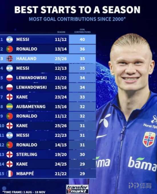本世紀球員賽季初參與進球榜:梅西C羅前二 本賽季的哈蘭德第三