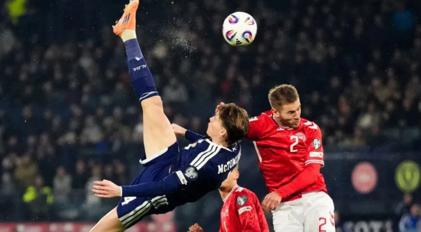 麥克托米奈再次為蘇格蘭隊建功——在球隊4-2戰勝丹麥隊的比賽中,他攻入一記精彩絕倫的倒鉤球。這位前曼聯中場球員,在短短12個月內完成了多項成就:隨那不勒斯隊奪得意甲冠軍、獲得金球獎提名,如今又隨國家隊晉級世界杯。