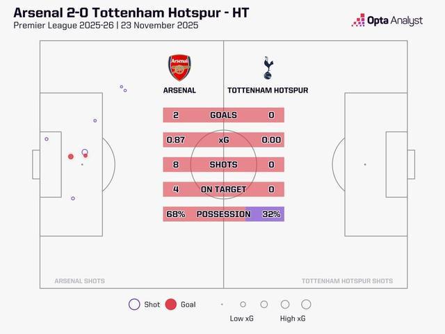 此役客場對陣阿森納,熱刺在上半場沒有完成一腳有效射門,而阿森納則嘗試了8次射門,4次射正,其中2次轉化為進球。