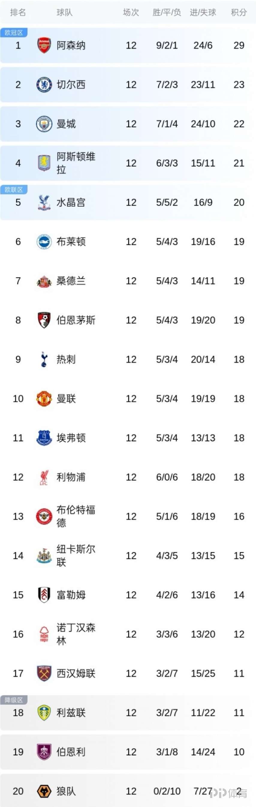 英超12輪戰罷,阿森納6分領跑,維拉第4,曼聯第10