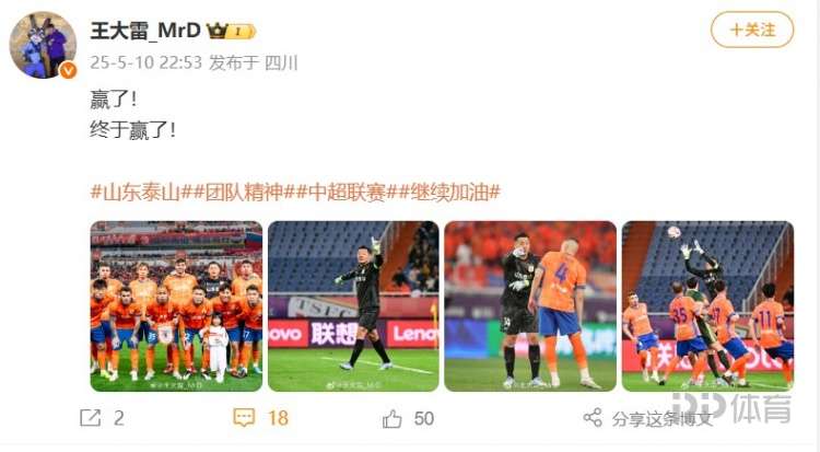 本場比賽,山東泰山球員王大雷首發(fā)打滿全場。賽后,他更新了社媒慶祝這場來之不易的勝利。